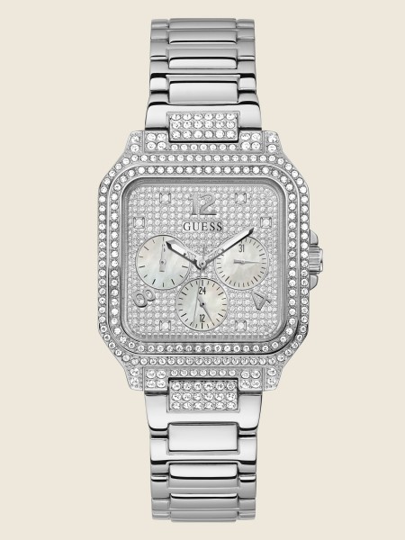 Az Art-deco Ihletet Szem Előtt Tartva Tervezték, Ez Az Ezüst Tónusú, Négyzet Alakú Többfunkciós óra Tokja és Számlapja Körül Kristály Díszítéssel Rendelkezik. Nap, Dátum és Nemzetközi Időtárcsázás.