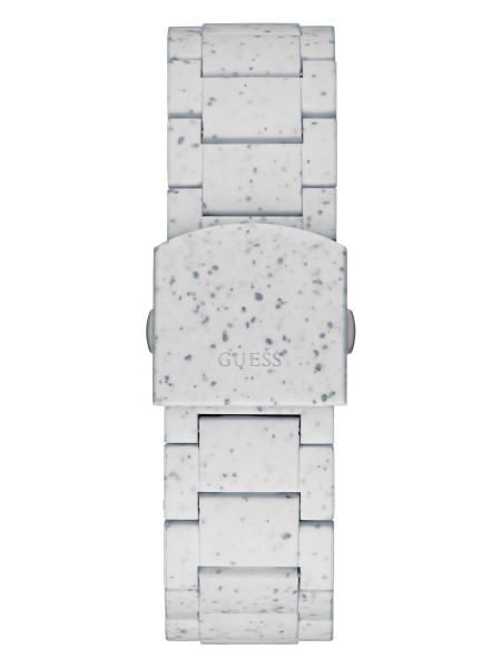 Made with recycled plastic collected from the ocean, this white analog watch features a splattered design throughout the bracelet and case.