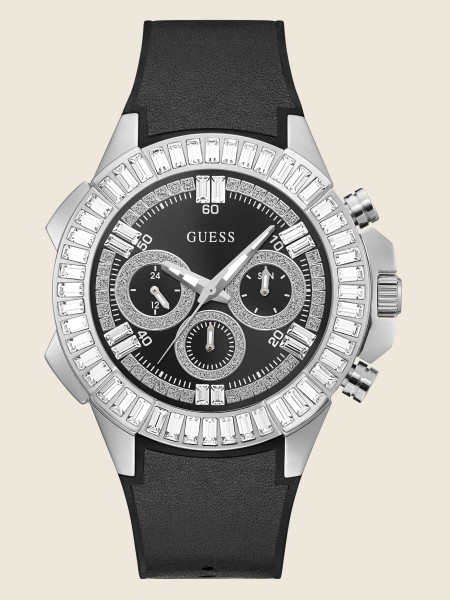 Oversized baguette crystals surround the silver-tone bezel of this bold multifunction watch, paired with a black leather and silicone flex strap.