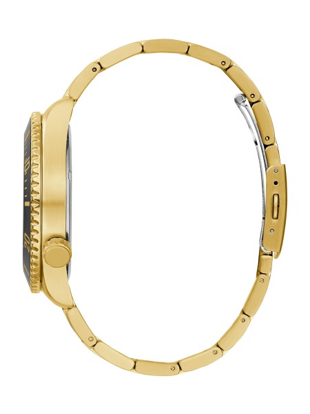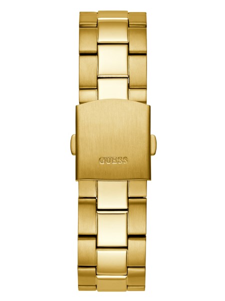 Kick it into high gear with this gold-tone watch featuring multifunctional dials, exposed gears, a black-tone face and a brushed linked band with a high-polish middle.