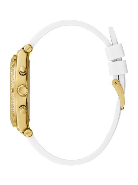 Emelje Fel Mindennapjait Ezzel A Modern órával, Amelynek Arany Tónusú Tokja, Az Előlap Körül és A Számlapon Strassz Díszítéssel, Valamint Kivágott Többfunkciós Segédórákkal Rendelkezik. Kényelmes Fehér Szilikon Pánttal Fejeződik Be.
