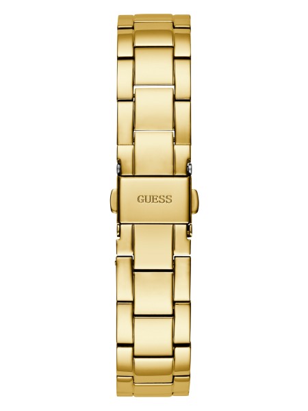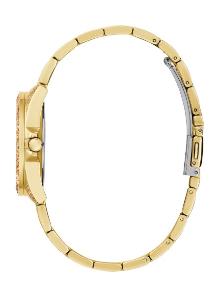 Az Egyszerű, De Kifinomult Arany Tónusú óra Monokromatikus, Bagett-metszetű Kristályokkal Rendelkezik Az Előlap Körül és órajelzőként A Minimalista Analóg Számlapon. Polírozott Acél Karkötővel és összecsukható Csattal Záródik.