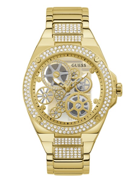 Stray from the ordinary when you wear this exquisite gold-tone analog watch featuring an exposed dial style revealing the inner mechanics of the timepiece. Completed by rhinestone accents around the bezel and a G-link bracelet.