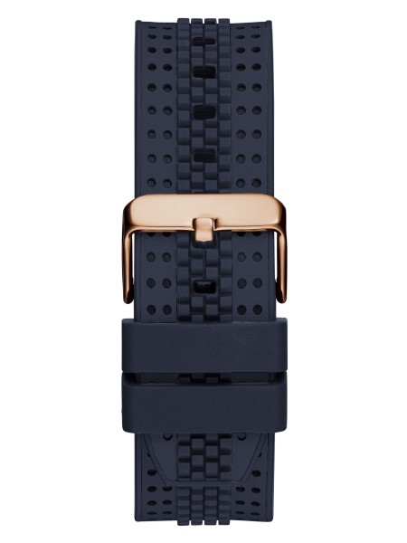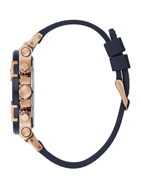 Where sporty design meets a rugged spirit. This navy watch features rose gold-tone accents, multifunction dials, exposed gears, a woven bezel and a perforated silicon band.