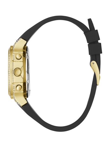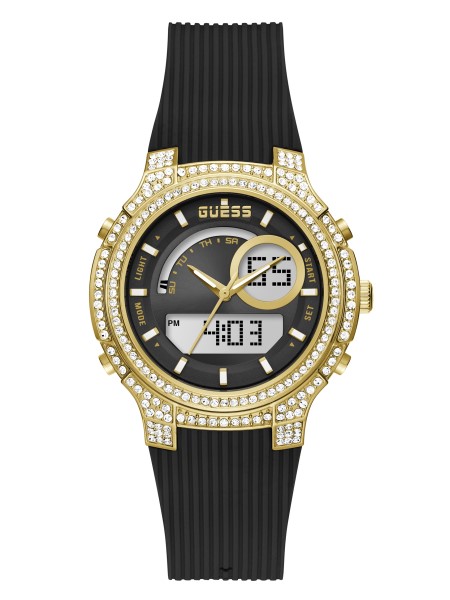 Ez A Sportos-elegáns óra útközben Is Elbűvölő, Arany Tónusú, Strasszokkal Díszített Előlappal és Fekete, Többfunkciós Számlappal, Vegyes Digitális és Analóg Funkciókkal Rendelkezik. Bordázott Szilikon Szíj.