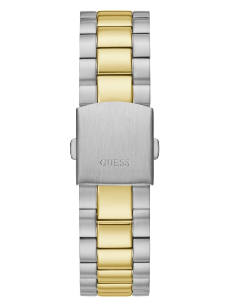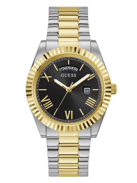 A timeless look, this eye-catching silver and gold-tone analog watch features a black dial with gold-tone accents, day/date functionalities and link bracelet band.