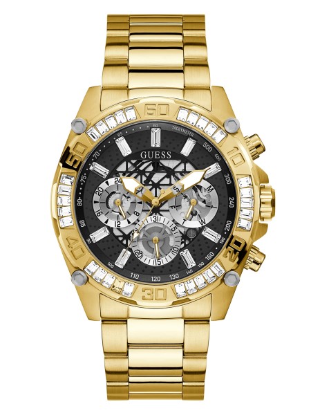 Add a polished edge to your look with this gold-tone multifunctional watch featuring baguette crystal detail, black dial and day, date and international capabilities.