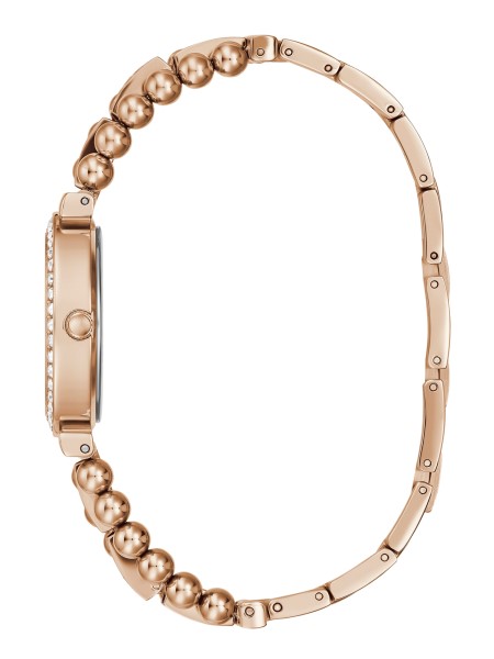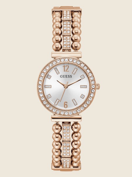 Formális Megjelenésének Befejező Simítása, Ez A Rózsaszín Arany Tónusú óra Bonyolult Karkötő-dizájnnal Büszkélkedhet, Gömb- és Strasszkötésekkel. Az Ezüst Tónusú Analóg Számlap Körül Strassz Díszítéssel, Csillogó Papírral, Valamint 12 és 6 órás Jelzőkkel.