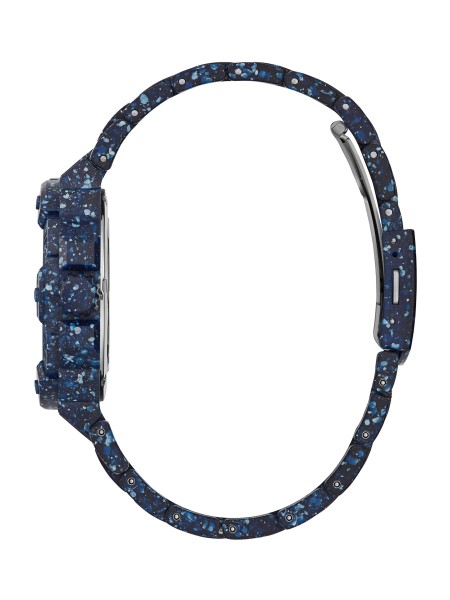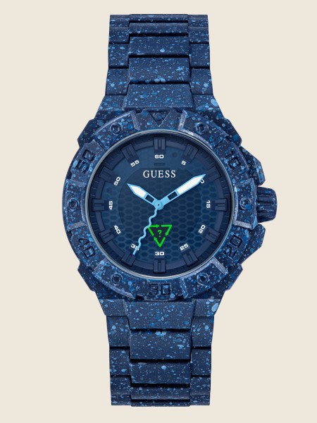 Made with recycled plastic collected from the ocean, this navy analog watch features a splattered design throughout the bracelet and case.
