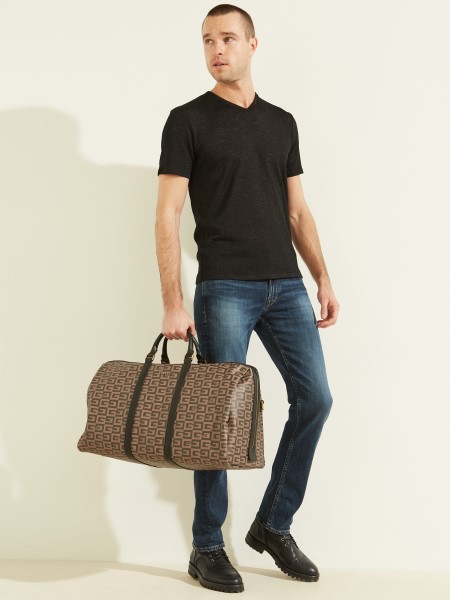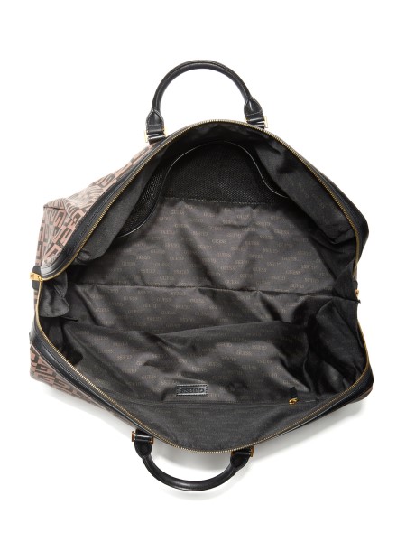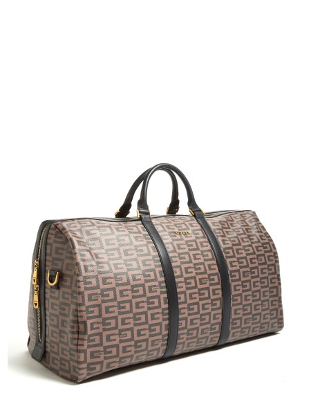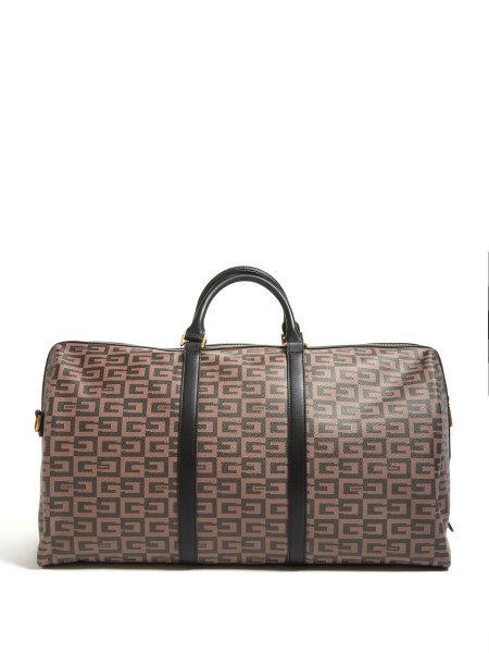 Your ideal getaway companion, this faux-leather weekender bag features an intricate logo pattern with emblem accent and dual top handles with contrasting piecing in the center of the large silhouette. Zip closure.