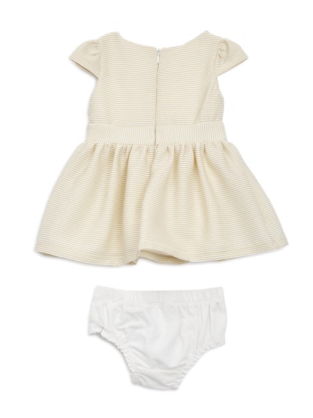 She'll look so cute dressing up in this ribbed dress featuring a lurex-inspired shimmer design, curved neckline, cap sleeves, shirred skirt and hidden back zipper. Solid bloomers included.