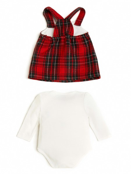 They'll look as cute as a button in this set featuring a long-sleeve crewneck bodysuit and plaid skirtall with bib straps and a front patch pocket with teddy bear patch.