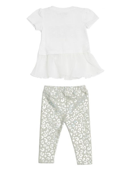 Let her run, crawl and play in this wildly cute set featuring a logo tee with a chiffon skirt and jersey leggings that both feature an iridescent leopard print.