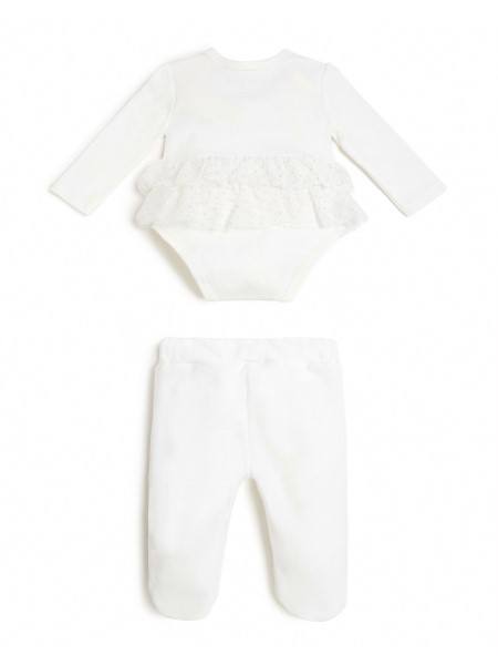 Designed in a soft velour fabrication, this matching set features a long-sleeve bodysuit with logo text and tulle mesh paneling at the waist. Complete by a pair of footed leggings.