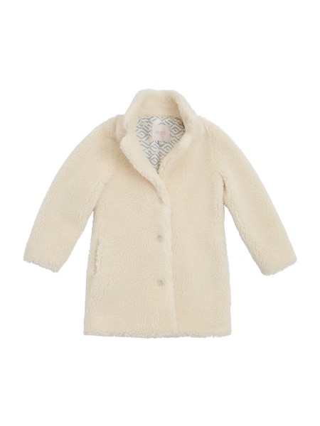 A classic faux-fur coat featuring an oversized notched collar and front button closures with an iconic graphic design at the back.