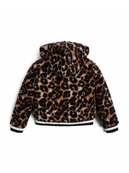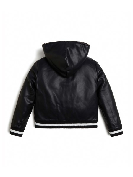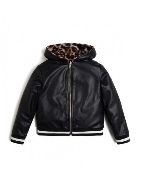 She can switch up her look whenever with this reversable flight jacket featuring a faux-leather construction and a reversed printed faux-fur lining. Complete with an attached hood and zip-up closure.