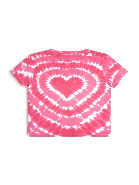 Made to match you. A tee for her featuring a tie-dye wash in a heart shape pattern, crew neckline and short sleeves. Uses organic cotton fiber.