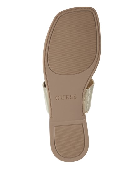 Divatos Cipő Most és Később. Műbőr Tangaszandál Szögletes Orrral, Strasszkő Logo Emblémával A Pántján és Egy Gore Darabbal A Nagyobb Mobilitás érdekében.