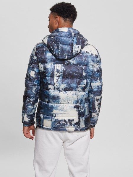 An ultra-lightweight puffer that you can grab and go. This silky downproof jacket features a removable hood, front zipper pockets, adjustable cuffs, printed lining and zip-up closure. Contains recycled plastic and is water repellent.