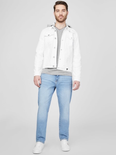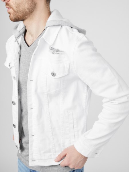 Klasszikus Megjelenést Kölcsönöz Megjelenésének Ezzel A Farmerdzsekivel, Amely Levehető Kötött Kapucnival, Gombos Elülső Záródással és Ferde Elülső Zsebekkel Rendelkezik. Szorongatott Részletek, Elülső Foltos Zsebek és Hegyes Gallér.