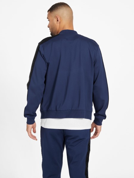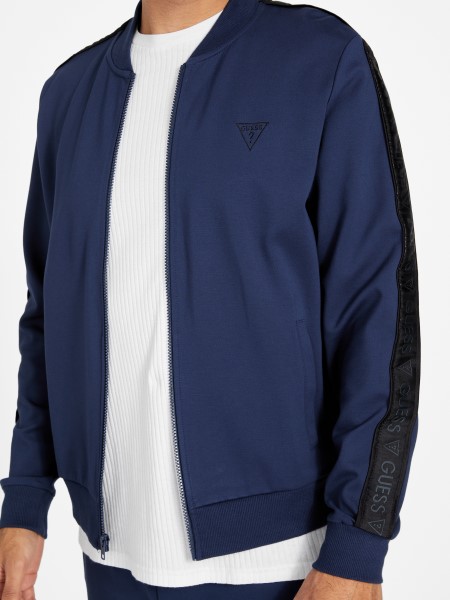 Könnyű Bomber Dzseki Logószalaggal A Hosszú Ujjakon, Bordázott Gallérral és Elülső Cipzáras Zsebekkel. Cipzáros Záródás. Egy Hozzáillő Készlet Rése.