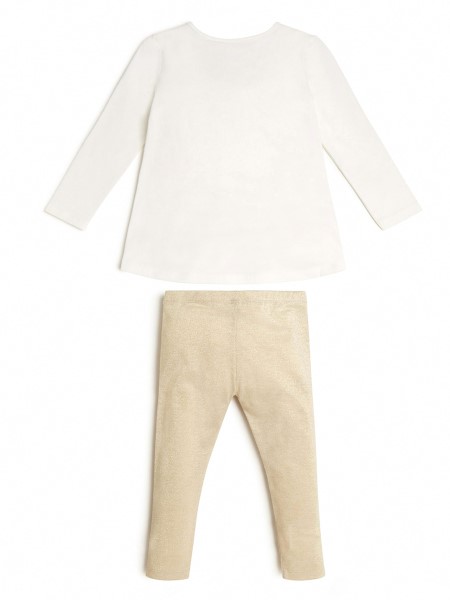 Keep her shining all day in this matching set that comes with a long-sleeve shirt featuring a fun logo graphic and matching metallic pull-on leggings.
