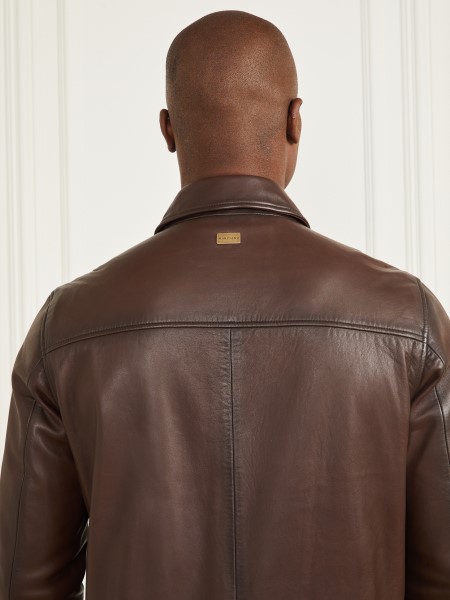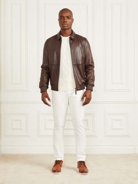 A refined retro-inspired staple for the modern man. Designed with a genuine leather fabrication, sleek collar, dual pockets, ribbed trim and zip closures.
