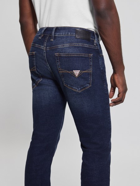 Ez A Jól Bevált, Sötét Színű Farmernadrág Egyenes Szárral, Bajuszokkal és Szándékos Kifakulással Rendelkezik.