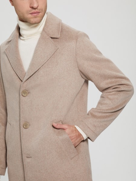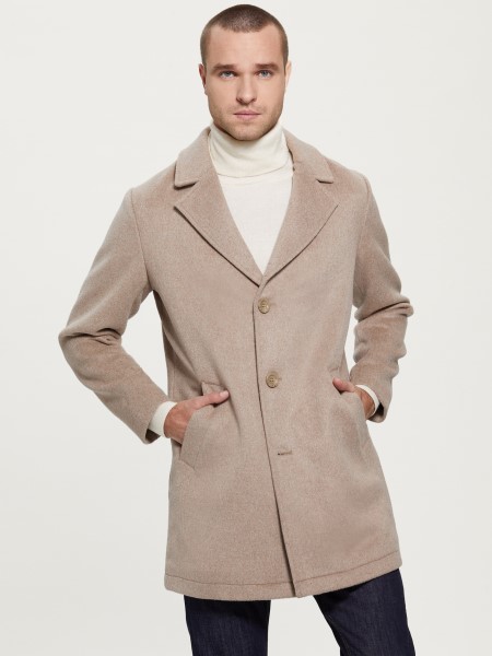 Take cover in this wool-blend coat featuring a V-neckline, notched collar, welt pockets, long sleeves and a back vent. Complete with interior slip pockets and satin lining.