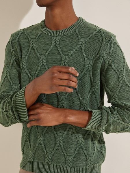 Layer on this classic crewneck sweater made in a striking cable knit weave and finished with ribbed cuffs.