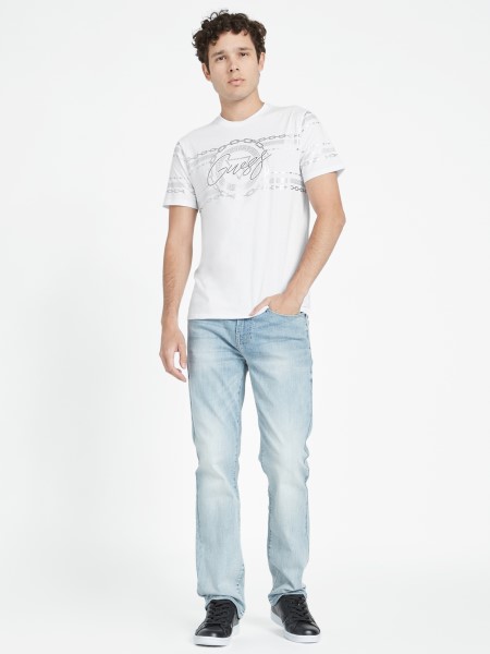 Merész, Fémes Láncgrafika Erősíti Ezt A Strasszos Logóval, Bő Nyakkivágással és Rövid Ujjú Trikó-pólót.