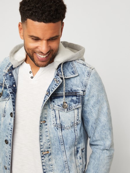 Könnyed Réteges Megjelenést Kap Ebben A Farmerdzsekiben, Amelyet Levehető, Kontrasztos, Húzózsinóros Kapucnival Terveztek. Hegyes Gallérral, Füles Mellzsebekkel és Cipzáras Zsebekkel Kiegészítve.