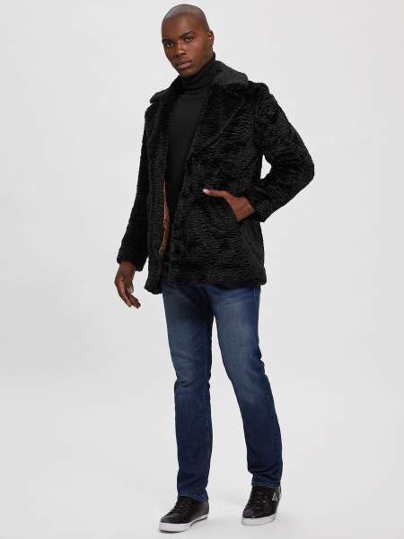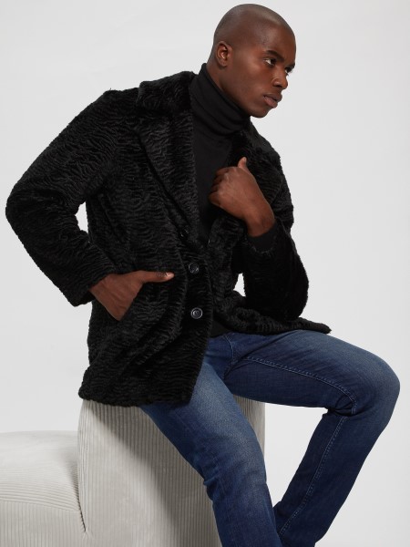 The finest in cold weather. A faux-fur coat in a curly astrakhan fur design features a wide notched collar, front pockets, long sleeves and a button-front closure.