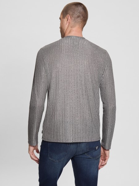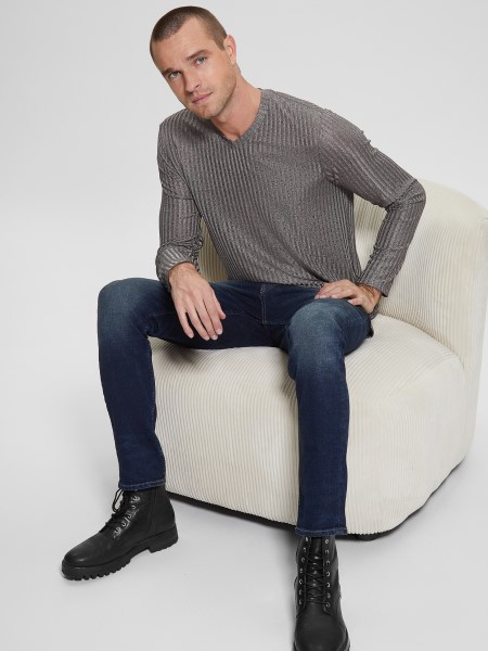 A Selymesen Puha Anyagból Készült Bordás Póló V-nyakkivágással és Hosszú Ujjakkal Rendelkezik.
