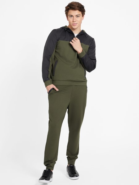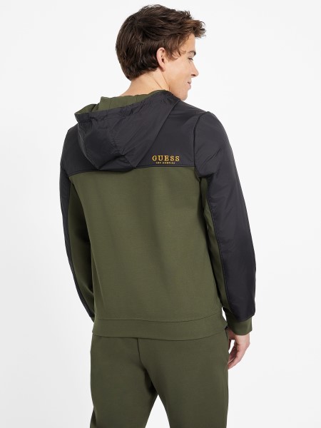 Laza Mindennapi Elengedhetetlen. Emblémás Kapucnis Kapucnis Húzózsinóros Kapucnival, Színes Blokk Kialakítással, Logós Szövetszalaggal A Mellkasánál, Kettős Cipzáras Zsebekkel, Bordás Díszítéssel és Hosszú Ujjakkal.