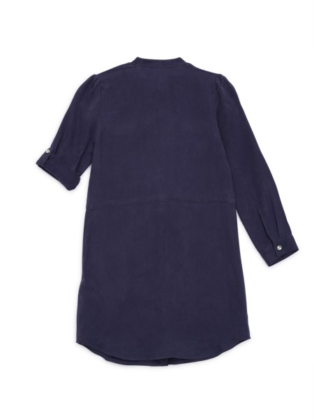 Easy to dress up or down, this classic shirt dress features a collarless design, with rhinestone button closures, a self-tie waist and adjustable long sleeves.