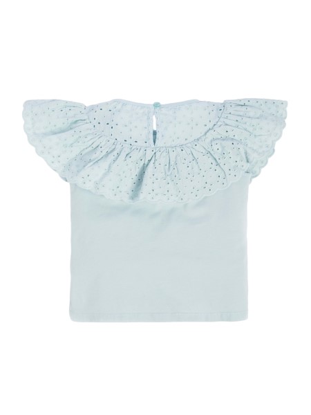 Light and flouncy, this crisp top for her is designed with an oversized Sangallo lace ruffle along the neckline with a knit body and back keyhole button closure.