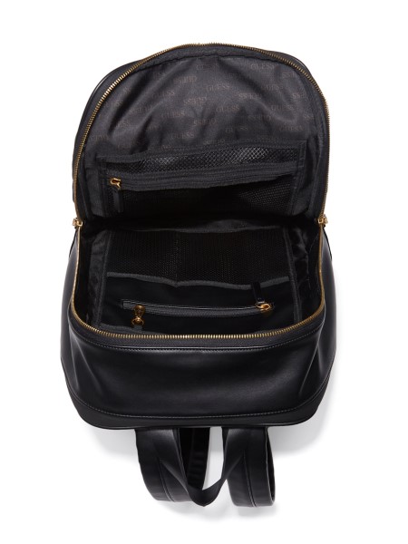 A must-own, smooth backpack featuring three zip compartments, front logo plaque, top handle and adjustable straps. Recycled faux-leather.