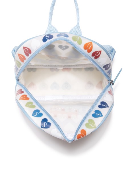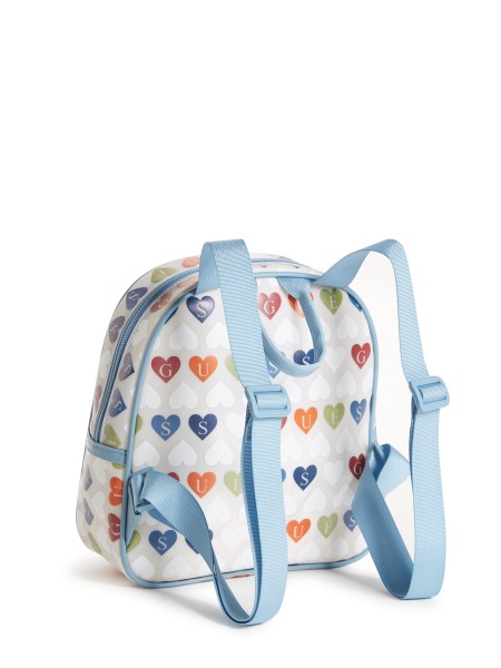 A cute jelly backpack she'll love carrying around. Features a heart and heart logo print, zip-around closure, front logo patch, zip-front pocket and adjustable straps.