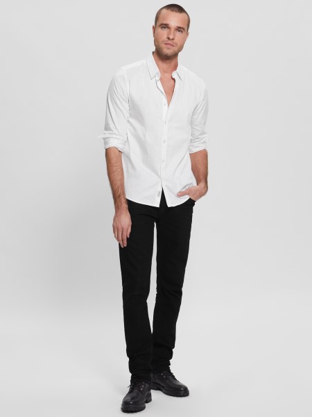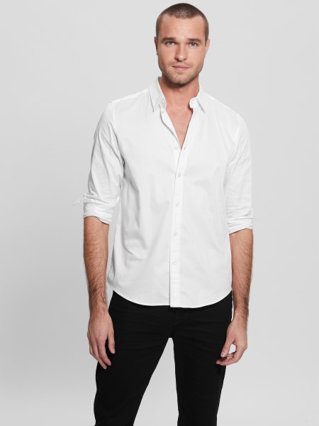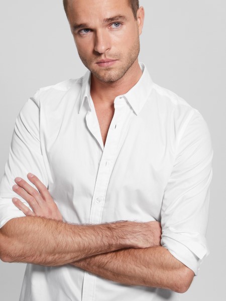 Maradjon Fényes Ebben A Sztreccs Szövésű Ingben, Amely Gombos Elülső Záródású, Hegyes Gallérral és Hosszú Ujjakkal Rendelkezik.