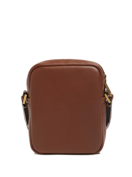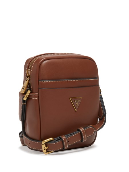 Carry along your essentials in this smooth vertical crossbody bag featuring a front slip pocket, front logo plaque, logo-stamped hardware, adjustable strap and zip-top closure. Recycled faux-leather.