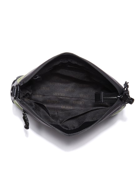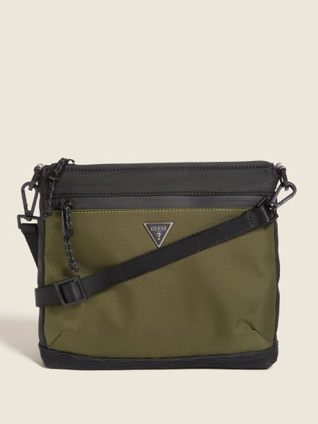 Ideal for on-the-go, this crossbody bag features a top zip closure and logo patch on the exterior zip pocket. Detachable, adjustable webbed strap.