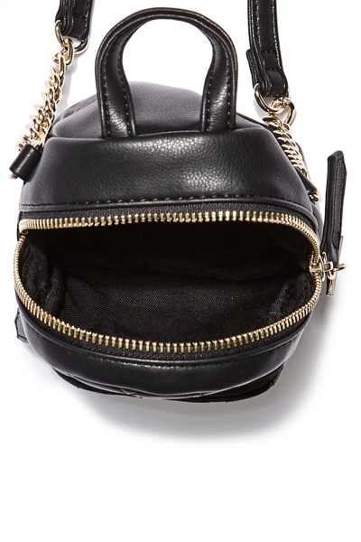 Műbőr Mini Hátizsák Crossbody Logóval, Elülső Cipzáras Zsebbel és Láncszegélyes Pánttal Van Kiegészítve.