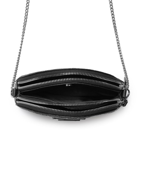 Kompakt Sziluett Dupla Tárolóhellyel, Ez A Kereszttartó Kettős Rekesszel, Felső Cipzárral, Emblémával és Láncszíjjal Rendelkezik.
