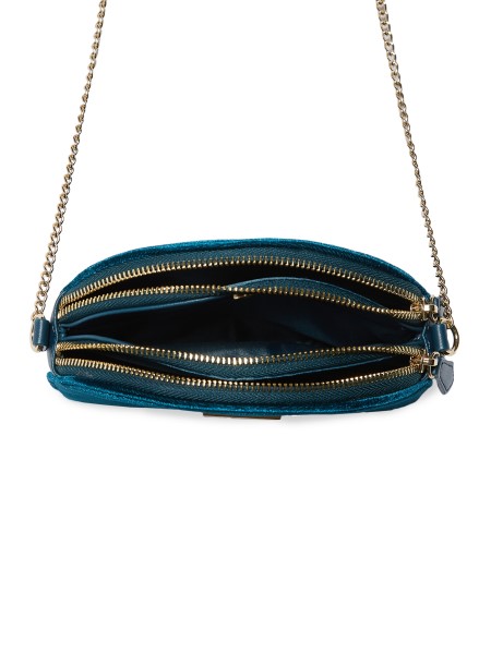 Kompakt Sziluett Dupla Tárolóhellyel, Ez A Kereszttartó Kettős Rekesszel, Felső Cipzárral, Emblémával és Láncszíjjal Rendelkezik.