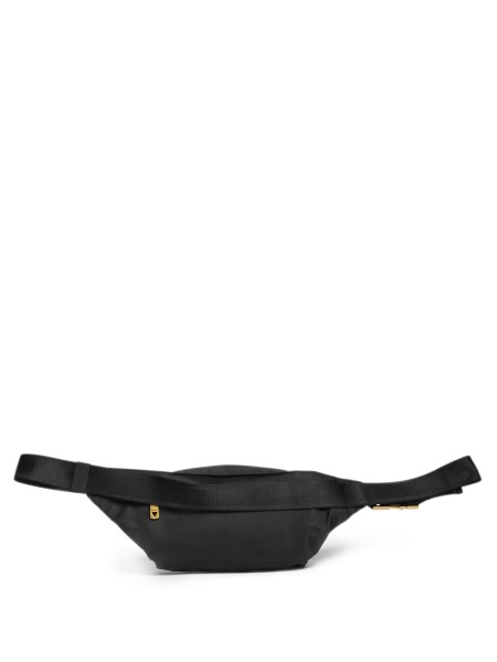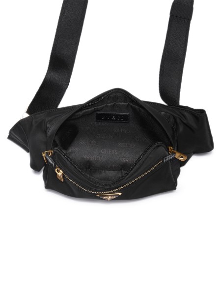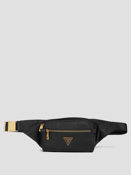 Designed in a smooth polyester nylon fabrication, this conveniently compact fanny pack features a dual-compartment design with zip closures and logo emblem at front. Completed by an adjustable webbed canvas strap and buckle.