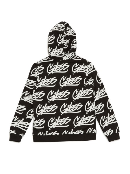 A Vastag Francia Frottír Konstrukcióban Készült, Cipzáras Kapucnis Kapucnis Allover Logóval, Osztott Kenguru Zsebekkel és Bordás Díszítéssel.