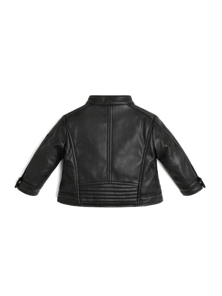 For your little urban dweller. An effortless moto jacket made from soft faux leather features a wrap collar, zip pockets, long sleeves with snap-button cuffs and a back quilted panel. Zip-up closure.