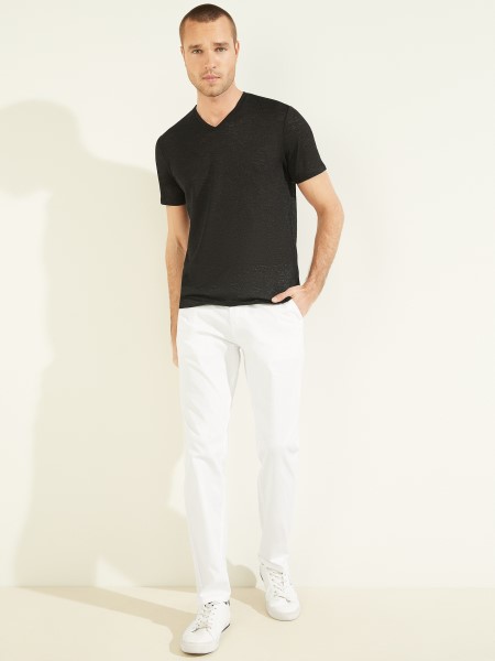 A knit tee made from a semi-sheer fabric for an elevated finish. V-neck and short sleeves.