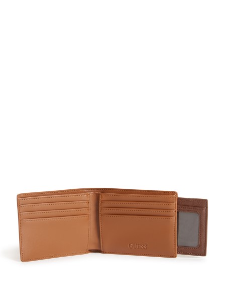A wallet for your everyday needs. Features a faux-leather construction, allover debossed logo, a bifold design and card slots for easy organization. Removable ID holder at the side.
